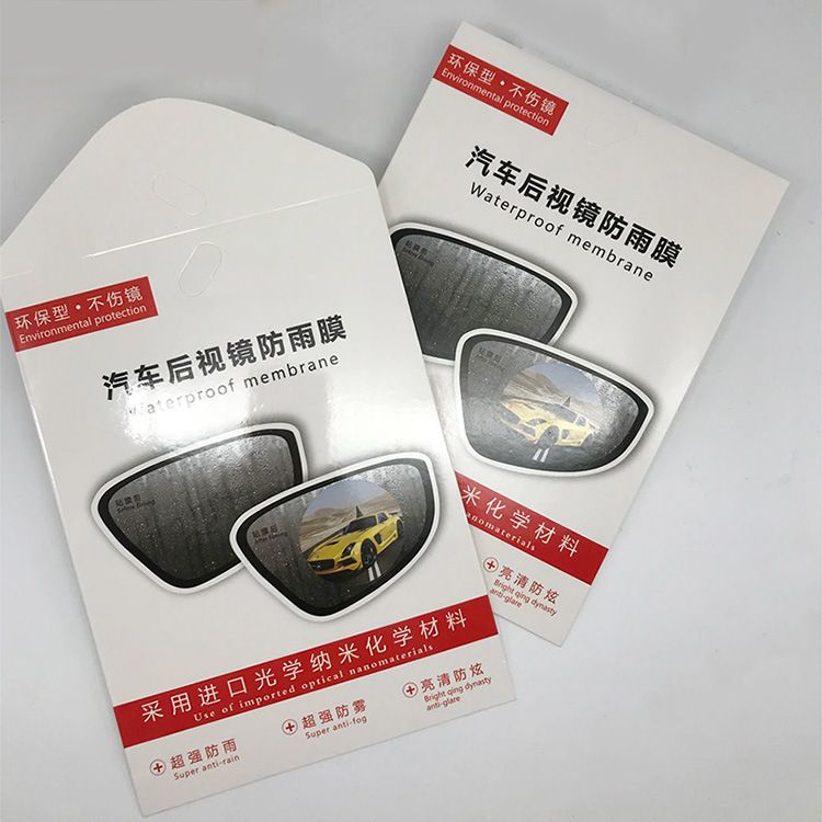 是最近流行起來的一種高科技保護膜,基材是PET膜,一面涂布高粘油膠,使用透明離型膜貼底面,另一面涂納米防水/親水材料,用藍色PET保護膜做面,使灑落在后視鏡上的雨霧可以很快滴落,而達到防雨防霧的效果。