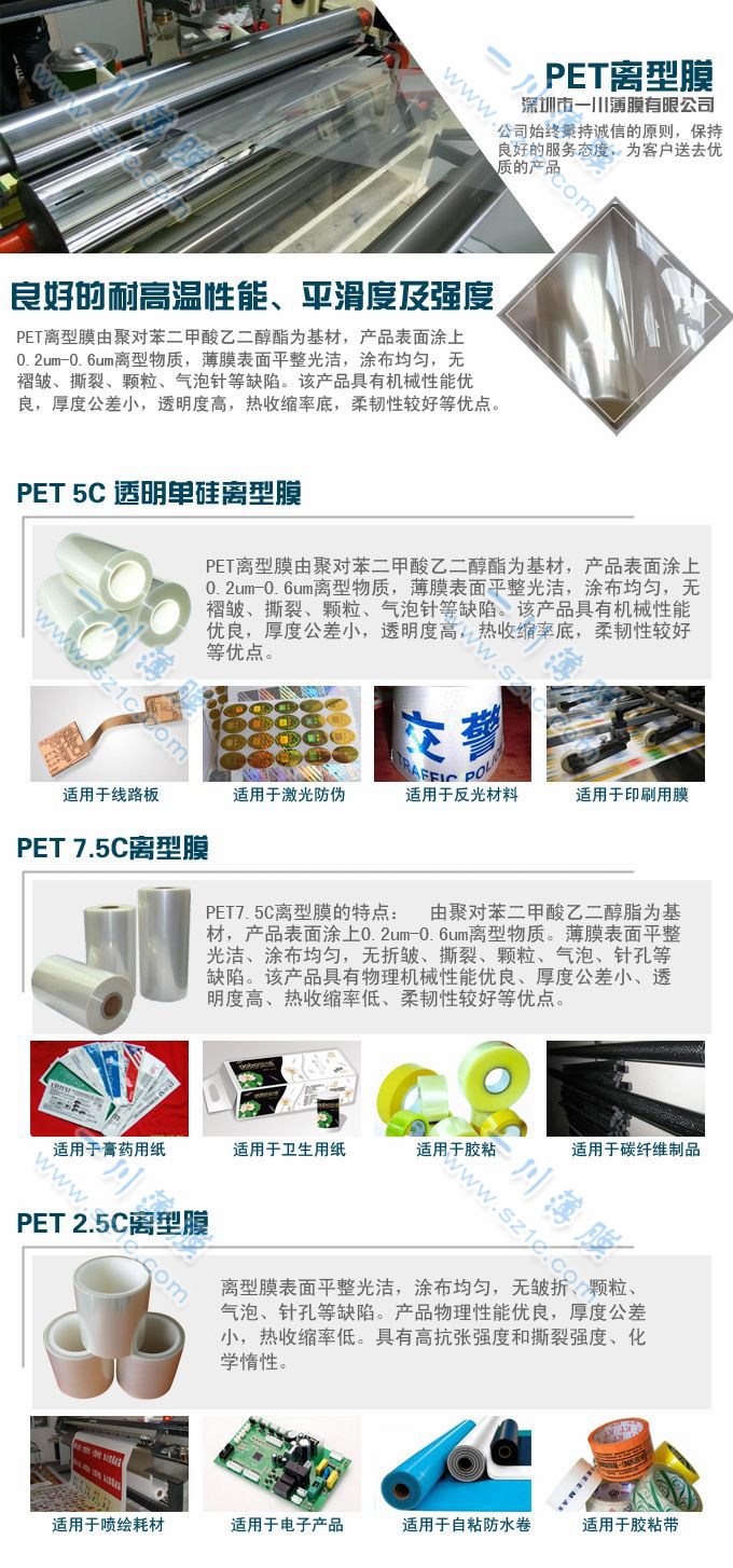 PET離型膜由聚對苯二甲酸乙二醇酯為基材,產品表面涂上0.2um-0.6um離型物質,薄膜表面平整光潔,涂布均勻,無褶皺、撕裂、顆粒、氣泡針等缺陷。該產品具有機械性能優良,厚度公差小,透明度高,熱收縮率底,柔韌性較好等優點。
