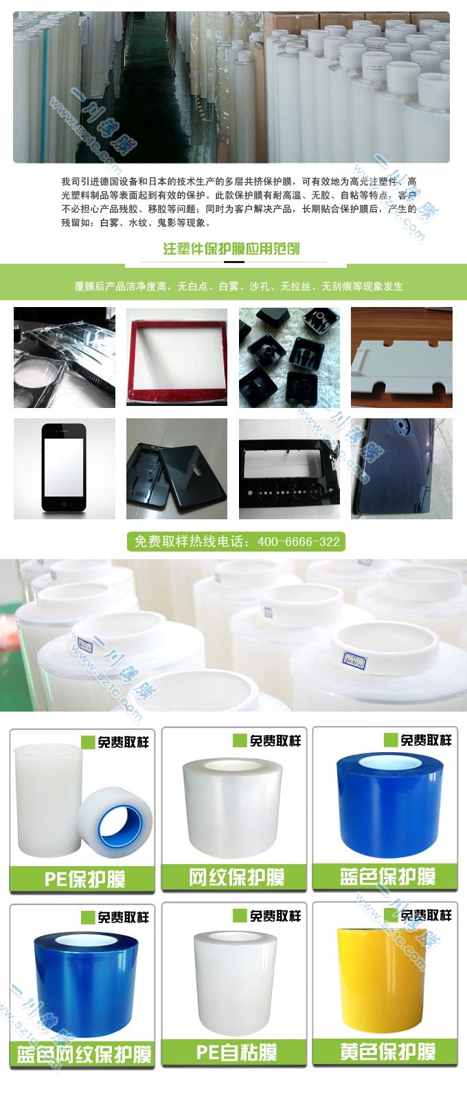 我司引進德國設備和日本的技術生產的多層共擠保護膜,可有效地為高光注塑件、高光塑料制品等表面起到有效的保護。此款保護膜有耐高溫、無膠、自粘等特點,客戶不必擔心產品殘膠、移膠等問題;同時為客戶解決,產品長期貼合保護膜后,產生的殘留如:白霧、水紋、鬼影等現象。